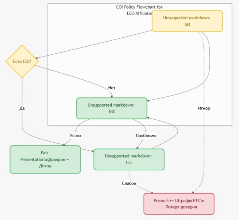 Идентификация COI: Перед публикацией спросите: «Моя рекомендация LEO мотивирована комиссией или анализом?» Если да — disclose.