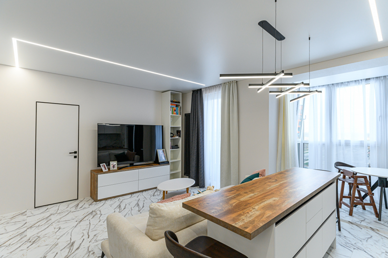 Такой потолок не отражает свет, что создает мягкое, равномерное освещение в помещении и исключает блики, характерные для глянцевых поверхностей. Кроме того, матовые потолки обладают влагостойкими свойствами, что делает их идеальным выбором для кухонь, ванных комнат и других помещений с повышенной влажностью. Они легко очищаются от пыли и загрязнений, не требуют сложного ухода и сохраняют привлекательный внешний вид на протяжении многих лет.