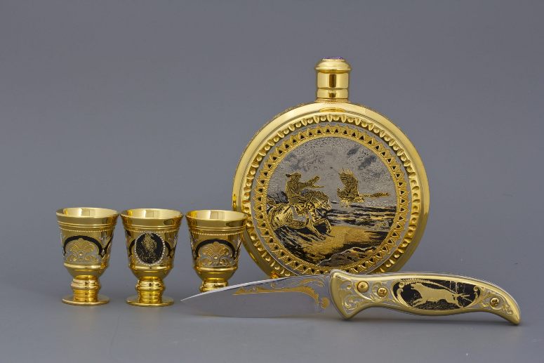 Водочные наборы, икорницы, подстаканники с позолотой превращают застолье в событие. Гости фотографируют, передают из рук в руки, рассматривают детали гравировки. Посуда служит десятилетиями: латунь, хрусталь, натуральный камень не теряют вида.